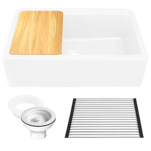 This sink is designed for maximum function. A true granite composite farmhouse workstation sink with a built-in ledge. Comes with an included stainless steel roll up mat and wood cutting board that fit right on the ledge so you can do your tasks over the sink! Part of our Plymouth Collection, this 33- inch apron sink also comes with a color-coordinated decorative disposal flange trim and basket strainer drain. The design of the sink is reversible and offers two different apron styles so you can choose more modern or traditionally styled apron to display. Granite composite material has benefits long known to design professionals. Made of 80% natural stone crushed stone which helps it to be both resistant to stains and scratches. The nonporous surface is hygienic and helps to ward off microbes. Because of its material composition, it can withstand thermal shocks and temperatures up to 560 degrees Fahrenheit. Stone is naturally sound-absorbing for a quieter kitchen. * Decorative disposal trim ring to be used with existing disposal flange. Please note sink is not perfect 90 degree rectangle - the outer sink edges taper by design inward towards 1/4 inch.
