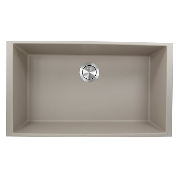Part of our Plymouth Collection, this 33- inch undermount sink is designed an made in Italy. Italian granite composite sinks offer durability and the large single bowl is accomodating to your largest bakeware, pots and pans! With benefits long known to design professionals, this sink is 80% natural stone which helps it to be both resistant to stains and scratches. The nonporous surface is hygienic and helps to ward off microbes. Because of its material composition, it can withstand thermal shocks and temperatures up to 560 degrees Fahrenheit. Stone is naturally sound-absorbing for a quieter kitchen. Subtle truffle color will go beautifully with many neutral color schemes. Because the drain is placed at the center back of the sink you have more unobstructed under cabinet space and basin surface area up top!