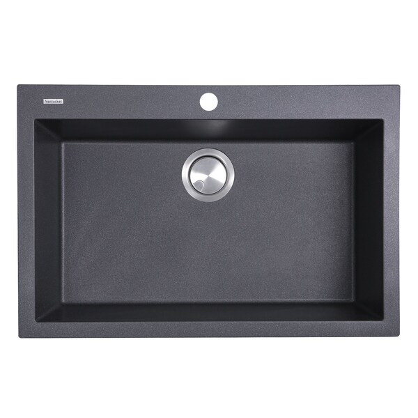 Under or over? Nantucket Sinks large single bowl dual-mount granite composite lets you choose what type of installation you want. This large single-bowl sink can be used as a topmount or undermount and accommodates all your kitchen needs. With benefits long known to design professionals, this sink is 80% natural stone which helps it to be both resistant to stains and scratches. The nonporous surface is hygienic and helps to ward off microbes. Because of its material composition, it can withstand thermal shocks and temperatures up to 560 degrees Fahrenheit. The rear placement of the drain provides you with more under counter space for storage. Stone is naturally sound-absorbing for a quieter kitchen. Classic black with metallic fleck makes for an eye-catching statement color!