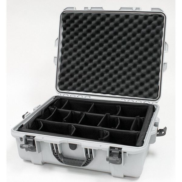 Protective Case, Bottom Depth 6 7/64 in, Color Silver, Inside Depth 8 13/16 in, Inside Length 22 in, Inside Width 17 in, Lid Depth 2 7/64 in, Material Lightweight NK-7(TM) Resin, Overall Depth 8 13/16 in, Overall Length 25 1/8 in, Overall Width 24 in, Standards ATA 300 (Impact Test), ASTM D4169 (Falling Rain-Vibration-Drop Tests), Mil-STD-810F (Immersion Test), IP 67 (Ingress Protection Tests-Dust and Immersion)., Weight 10.6 lb
