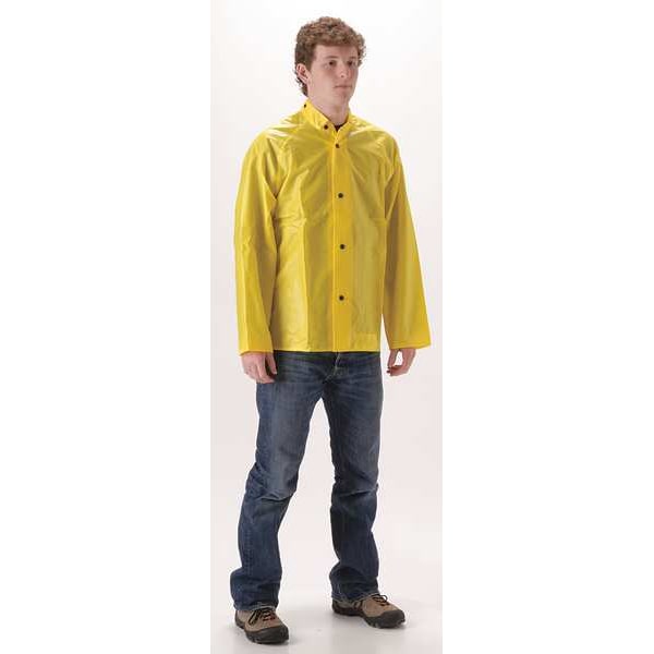 Rain Jacket, Size 4XL, Number of Inside Pockets 0, Number of Outside Pockets 0, Color Yellow, Front Closure Type Snaps, Gender Unisex, Material Polyurethane/Nylon, Length 30 in, Thickness 0.25 mm