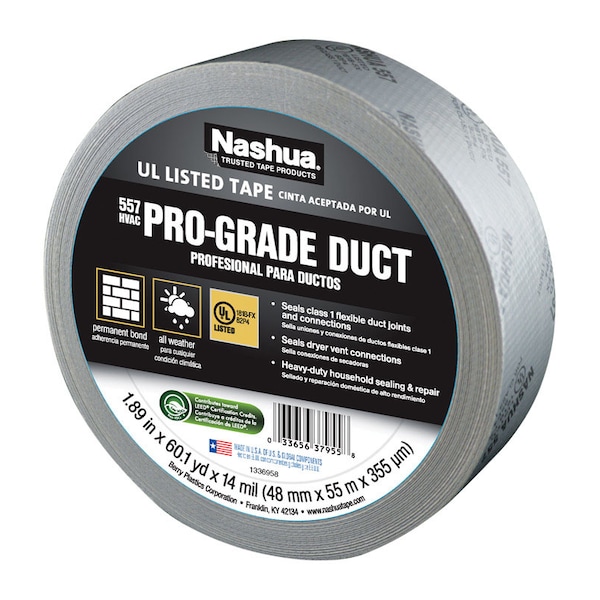 Nashua 557 PRO-GRADE is UL code approved for sealing Class 1 flexible (181B-FX) duct joints and connections. With a polyethylene-coated cloth backing printed for easy inspection and a durable rubber adhesive Nashua 557 is the ideal choice for sealing flexible duct work dryer vents and for heavy-duty household repairs. Nashua Trusted Tapes get the job done right the first time every time. Meets code requirements for sealing flexible air ducts and connections. Can contribute toward satisfying EA Credit 1 (Optimize Energy Performance) under LEED. High strength to withstand duct system pressure. Resistant to moisture and mold. High strength and durable. Conformable to wrap ducts for an effective seal. 181B-FX printed for easy inspector identification. Can contribute toward satisfying EQ credit 4.1 (Low Emitting Materials) under LEED.