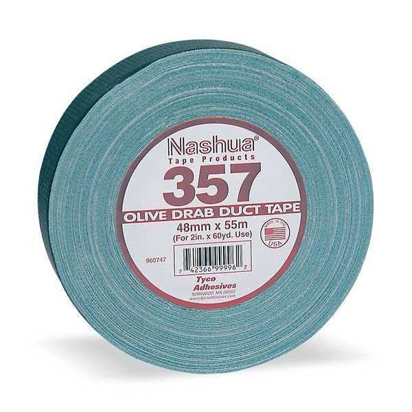 Adhesion to Steel 95 oz/in, Tape Brand Nashua, Clean Removal Time Not Rated, Assembly and Manufacturing, Construction, General Maintenance and Repair, Metalworking, Warehouse, Environment Indoor/Outdoor, Imperial Tape Length 60 yd, Imperial Tape Width 2 3/4 in, Continuous Roll, Series 357, Tape Adhesive Material Rubber, Tape Backing Material Polyethylene Coated Cloth, Tape Color Olive, Tape Sub-Type General Purpose Duct Tape, Tape Thickness 13 mil, Duct and Repair Tape