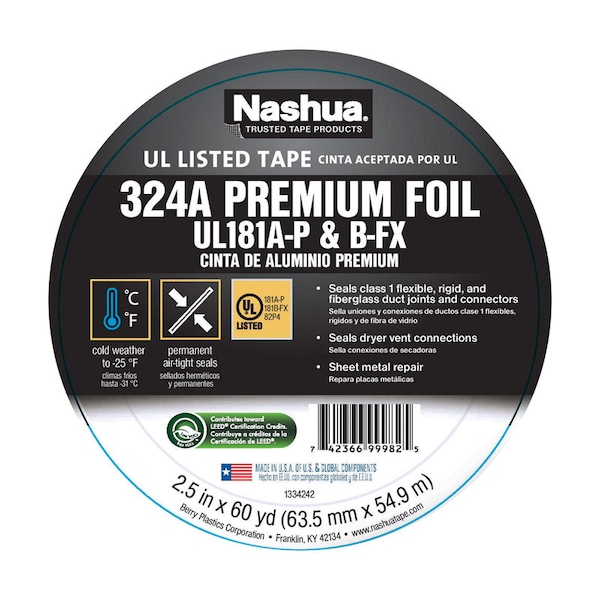 Nashua 324A Cold Weather foil tape is UL code approved for sealing Class 1 rigid (181 Amp-P) or Class 1 flexible (181B-FX) duct joints and connections. With a heavy-duty foil backing that is printed for easy inspection and an aggressive acrylic adhesive Nashua 324 Amp is the ideal choice for heating, ventilation and air conditioning installations that require a code-approved product. Nashua Trusted Tapes get the job done right, the first time, every time.