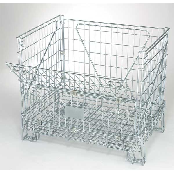 Collapsible Bulk Container, Color Silver, Container Wall Type Vented, Folded Depth 32 3/4 in, Folded Height 12 in, Folded Width 43 3/4 in, Fork Entry 4-Way Entry, Fork Pockets Yes, Maximum Operating Temperature 300 Degrees F, Minimum Operating Temperature -50 Degrees F, Mobility Stationary, Number of Drop Doors 1, Overall Height 39 in, Overall Length 32 in, Overall Width 42 in, Stackable Yes, Stacking Capacity 2,000 lb, Volume Capacity 24.3 cu ft, Weight Capacity 2,000 lb, Collapsible Yes