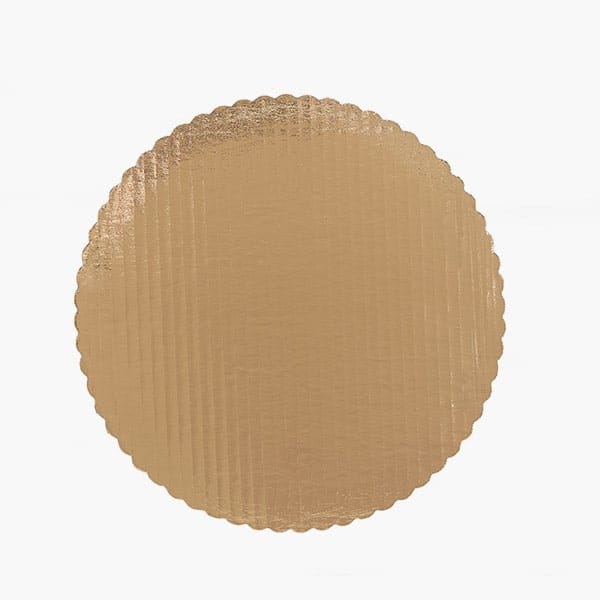 Beautiful gold 10 round scalloped edge cake boards sold in 100 pack. This product is made of sturdy single wall corrugated cardboard to provide ample support for the even heaviest of cakes.