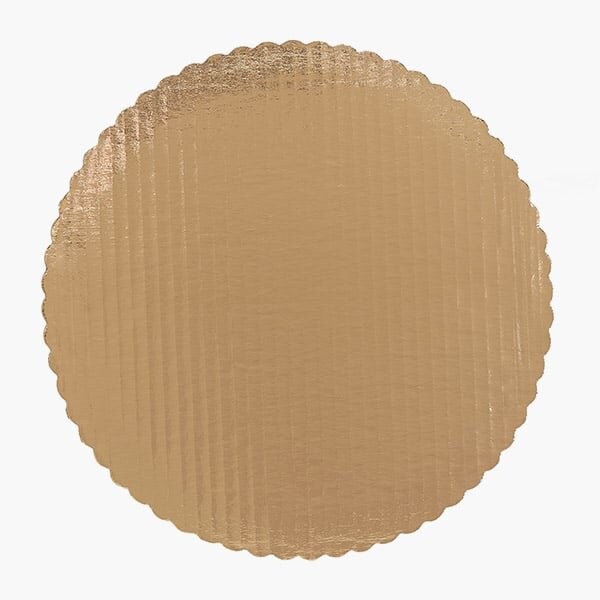 Beautiful gold 12 round scalloped edge cake boards sold in 100 pack. This product is made of sturdy single wall corrugated cardboard to provide ample support for the even heaviest of cakes.