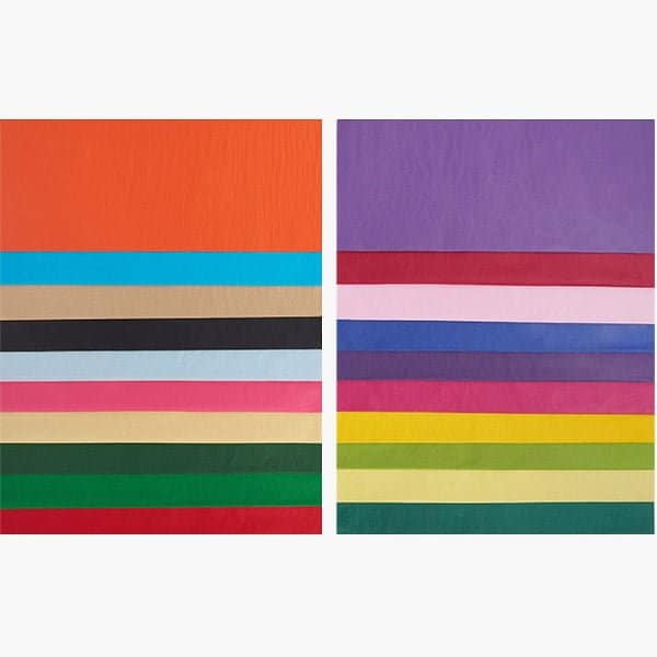20 assorted colors of 20x30in tissue sheets. 480 total sheets. Color Flo Tissue Paper is made from 100% Post Industrial Recycled Fibers. Green Way Eco-Friendly Packaging. Colors included are Red, Festive Green, Forest Green, French Vanilla, Azalea, Purple, Dark Blue, Light Pink, Cranberry, Lavender, Teal, Light Yellow, Oasis Green, Dandelion, Cerise, Light Blue, Black, Desert Tan, Turquoise, and Orange.