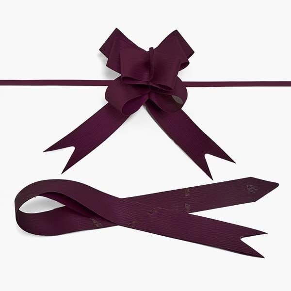 4 Matte Burgundy Butterfly Pull Bows are made of 100% polypropylene and are durable with a soft, paper feel. The embossed ribbon is approximately 1 wide and tail is 17 long. Total bow length is 4. Pack of 25. These bows coordinate with our