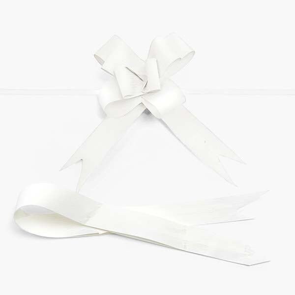 4 Matte White Butterfly Pull Bows are made of 100% polypropylene and are durable with a soft, paper feel. The embossed ribbon is approximately 1 wide and tail is 17 long. Total bow length is 4. Pack of 25. These bows coordinate with our