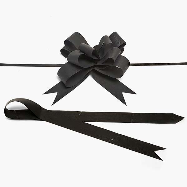 6 Matte Black Butterfly Pull Bows are made of 100% polypropylene and are durable with a soft, paper feel. The embossed ribbon is approximately 1 1/2 wide and tail is 34 long. Total bow length is 6 3/4. Pack of 12. These bows coordinate with our