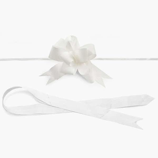 6 Matte White Butterfly Pull Bows are made of 100% polypropylene and are durable with a soft, paper feel. The embossed ribbon is approximately 1 1/2 wide and tail is 34 long. Total bow length is 6 3/4. Pack of 12. These bows coordinate with our