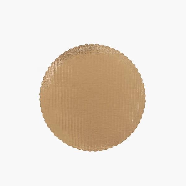 Beautiful gold 8in round scalloped edge cake boards sold in 100 pack. This product is made of sturdy single wall corrugated cardboard to provide ample support for the even heaviest of cakes.