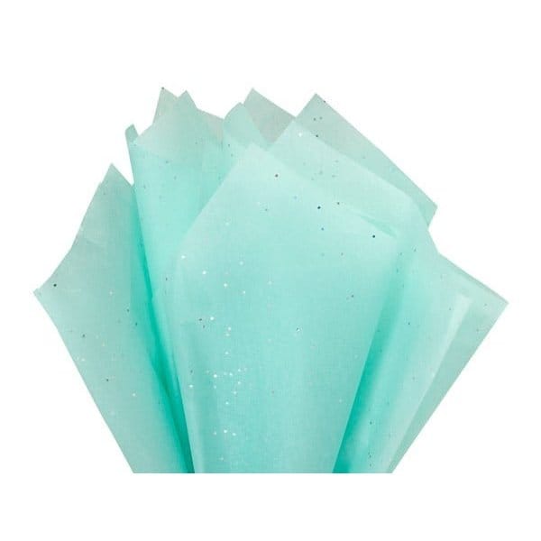 Aquamarine Gemstone Tissue Paper by the ream is great for baby, wedding and birthday packaging. A beautiful light aqua color tissue with matching glitter accents.