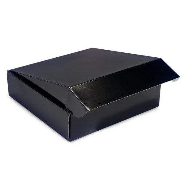 Black Gloss Gourmet Shipping Boxes are 1-piece with fold-over lid. Perfect for gourmet gift packaging! Outside dimensions of box are: 12 3/4 x 12 1/4 x 3 1/4.