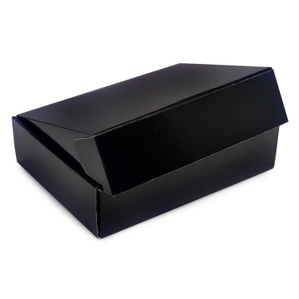 Black large gourmet shipping boxes. These boxes are 1 piece with a fold over, locking tuck lid. Outer dimensions are: 12 3/4 x 9 1/4 x 3 1/4.