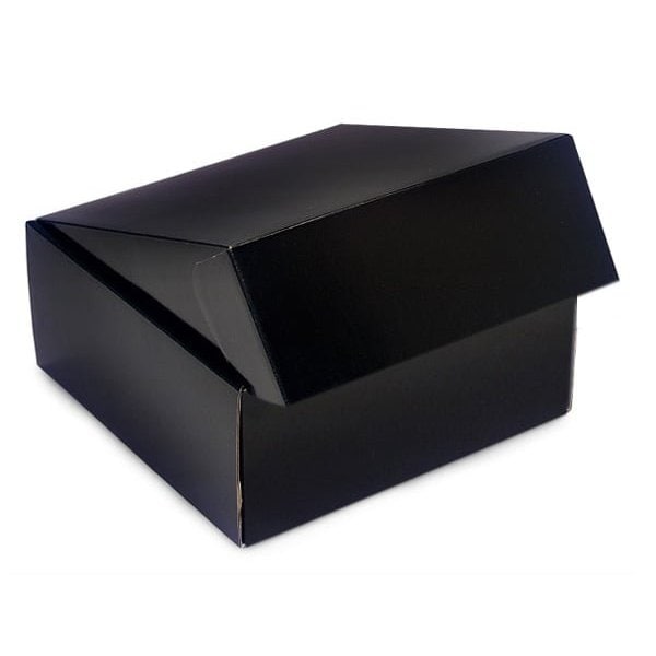 Black small shipping boxes for gourmet gifts. 1-piece boxes have a fold-over lid. Perfect for gourmet gift packaging! Outer dimensions are: 8 3/4 x 8 1/4 x 3 1/4.