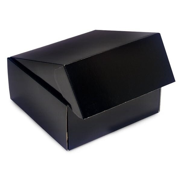 Black medium gourmet shipping boxes for packaged gifts. These rigid boxes are 1 piece with a fold over, locking tuck lid. Outer dimensions are: 9 3/4 x 9 3/8 x 4 1/4. Sold in a small pack of 6.