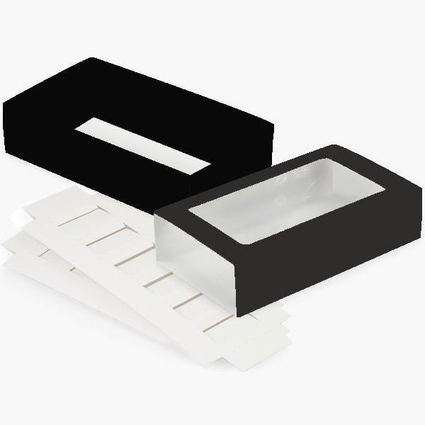 8 1/4x5x2 Black Macaron Cookie box set includes: 10 bases, 10 sleeves and 20 inserts. Everything you need for easy cookie packaging! Each box holds 12 cookies.