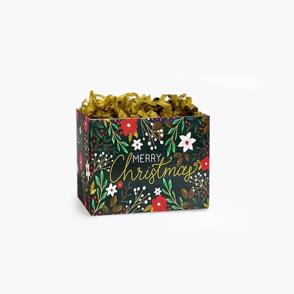 Small Botanical Christmas basket boxes feature holiday foliage surrounding gold Merry Christmas text. Box background is black. Boxes measure 6.75x4x5 and are sold in pack of 6.