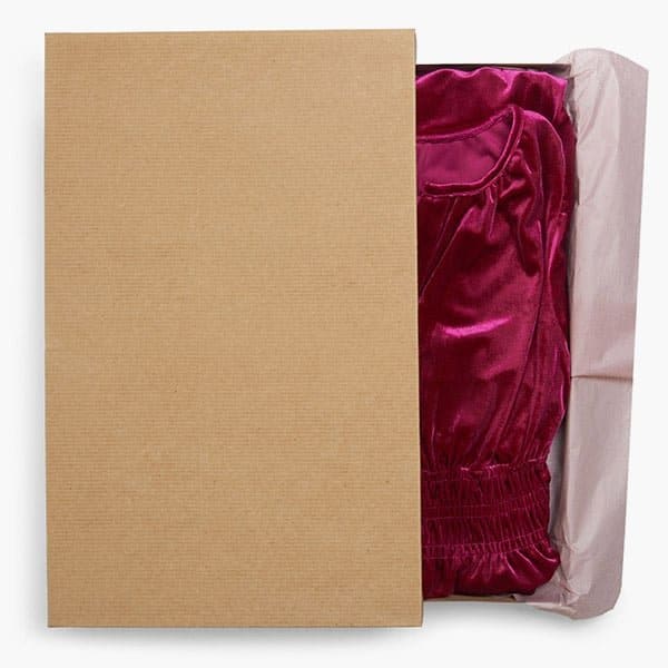 Brown Kraft pop up apparel boxes are packed 50 per carton and feature a varnish pinstripe exterior and kraft interior. 19x12x3 is used for dresses, suits, and place mats. Two-piece box is 100% Recycled. Board thickness is.020.