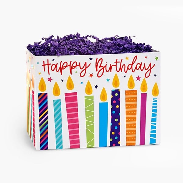 Candle Birthday large basket boxes feature bright candles and happy birthday text. Boxes measure 10.25x6x7.5 and are sold in pack of 6.