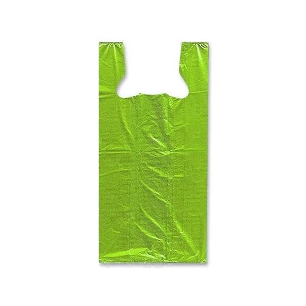 Medium Citrus Plastic T-Sacks in 1000 bulk pack. 60 mil film and is minimum 15% recycled materials. Green Way Eco-Friendly Packaging. These t-shirt bags feature center hanging tabs for use with t-sack holders.