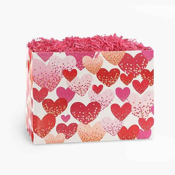 Large Confetti Hearts basket boxes feature pink and red hearts with confetti accents. Boxes measure 10.25x6x7.5 and are sold in pack of 6.