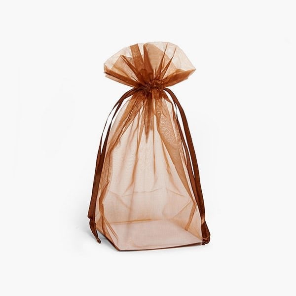Copper Square Gusseted Sheer Bags are 4x4x10 with a white cardboard insert measuring 4 x 4. Bags have a satin ribbon drawstring closure. Sold in a pack of 10.