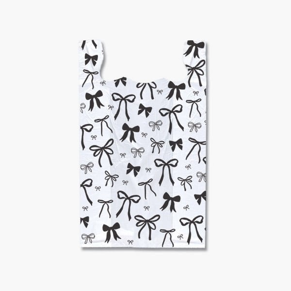 Coquette Bows.65 mil plastic T-Sacks in 1000 pack. Scattered Bow design is printed on both sides. A Green Way Eco Friendly Packaging product.
