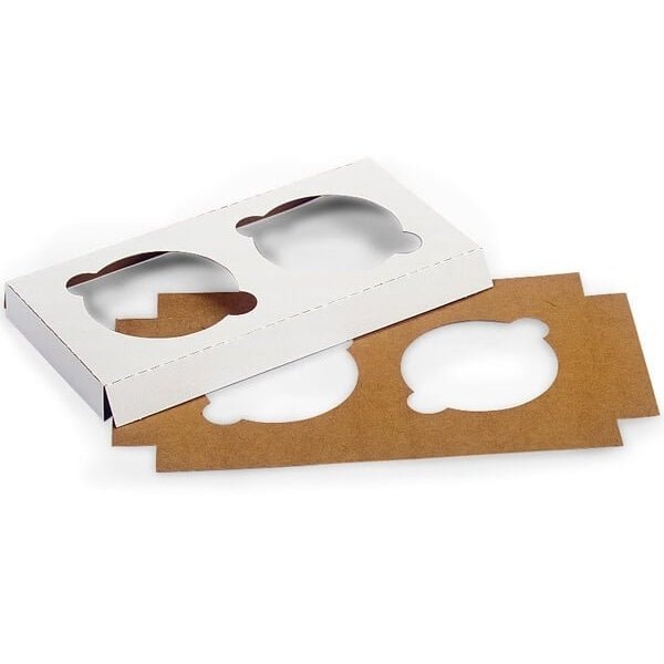 Holds 2 regular size 2 5/8 oz cupcakes. Fits our 8x4x4 Bakery Boxes BBCH844, BBPK844, BBWH844 for 2 cupcakes or use two of these inserts in our 8x8x4 Bakery Boxes BBCH884, BBPK884 & BBWH884 for 4 cupcakes. Complies with FDA regulations for food packaging
