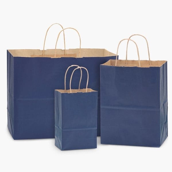 Dark Blue Kraft Paper Shopping Bag Assortment includes 125 Bags Total - 50 Rose, 50 Cub, and 25 Vogue. These gift bags are recyclable and meet requirements for most areas with plastic bag bans.
