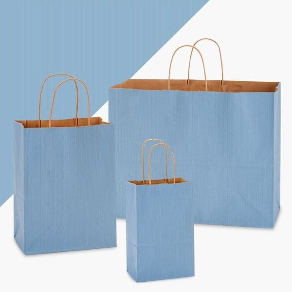 125 Bag Assortment of French Blue Shadow Stripe Shopping Bags are made from 50% recycled paper. Produced with water based inks and glues. Assortments consists of 50 Rose, 50 Cub, 25 Vogue size bags.