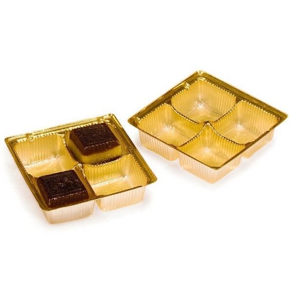 3 7/16 x 3 7/16 x 15/16 Square Gold Candy Trays in 500 pack are 2 3/4 x 2 3/4 at bottom and has 4 sections measuring 1 1/8 x 1 1/8in each. Complies with FDA regulations for food packaging.