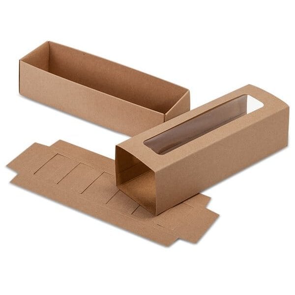 Kraft macaron and cookie box with large single window, pre-packed set. Each pack includes: 10 bases, 10 sleeves and 10 inserts. Everything you need for easy cookie packaging! Each box holds 6 cookies.