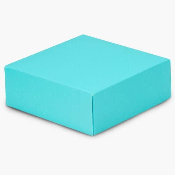 Turquoise Blue 4x4x1.5 Box Lids sold in sets of 25. Box bases sold separately. Packed flat. Fold & pinch lock construction. Mix & match colors. Pantone color 3105.