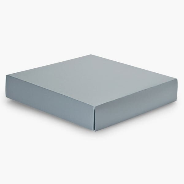 Silver 10x10x2 Box Lids sold in sets of 25. Box bases sold separately. Packed flat. Fold & pinch lock construction. Mix & match colors. Pantone color 877.