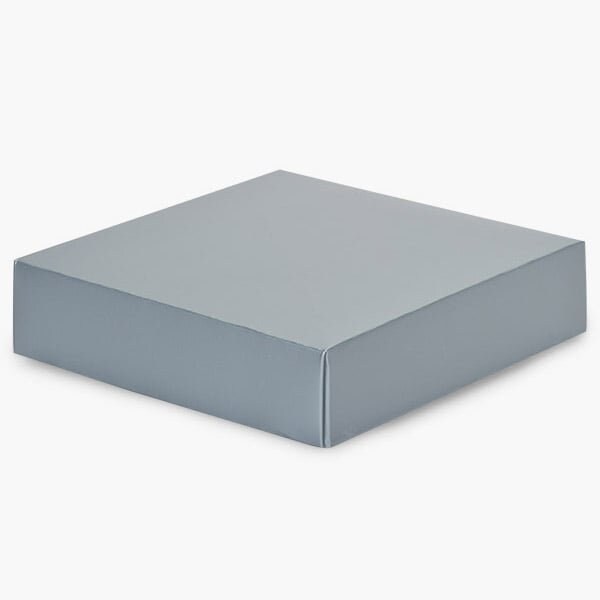 Silver 6x6x1.5 Box Lids sold in sets of 25. Box bases sold separately. Packed flat. Fold & pinch lock construction. Mix & match colors. Pantone color 877.