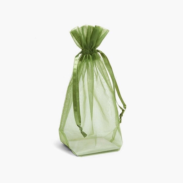 Olive Square Gusseted Sheer Bags are 3x3x9 with a white cardboard insert measuring 3 x 3. Bags have a satin ribbon drawstring closure. Sold in a pack of 10.
