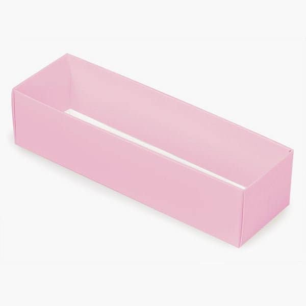 Pink Single Macaron Cookie Box Base. Use wih any color macaron sleeve to create your own look. Complies with FDA regulations for food contact. Inside dimensions of base when assembled: 8 1/8 x 2 7/16 x 1 15/16. Closest PMS color match: 705C.
