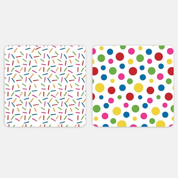 Rainbow Confetti Cookie Backers are printed on one side with colorful sprinkles and the other with dots. They are made of sturdy 16 Pt board and are food safe and grease-resitant. Use with our heat sealable cello bags or trim to desired size.