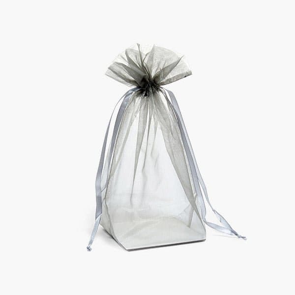 Silver Square Gusseted Sheer Bags are 4x4x10 with a white cardboard insert measuring 4 x 4. Bags have a satin ribbon drawstring closure. Sold in a pack of 10.