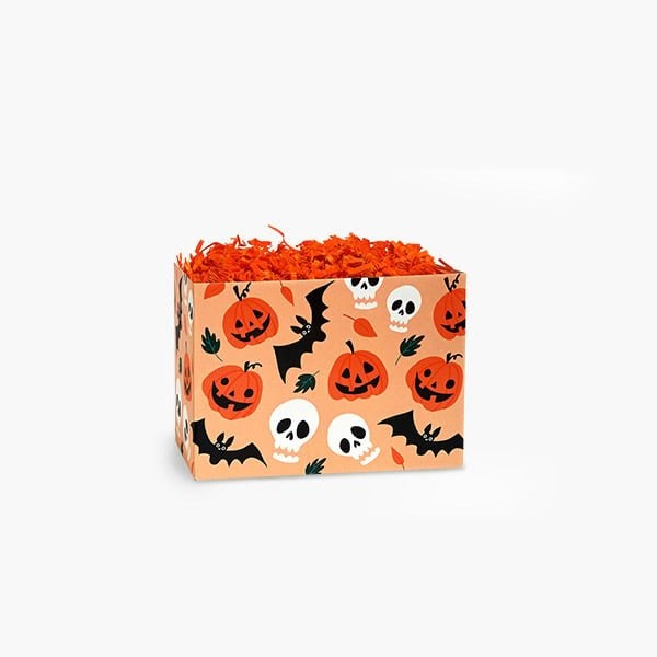 Small Spook-tacular basket boxes have pumpkins, black bats, and skulls on orange background. Its a fun Halloween design. Boxes measure 6.75x4x5 and are sold in pack of 6.