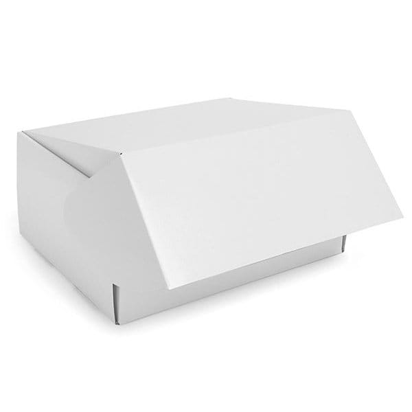 White gloss 12x9x5 shipping boxes for gourmet gifts. 1-piece boxes have a fold-over lid. Perfect for gourmet gift packaging!