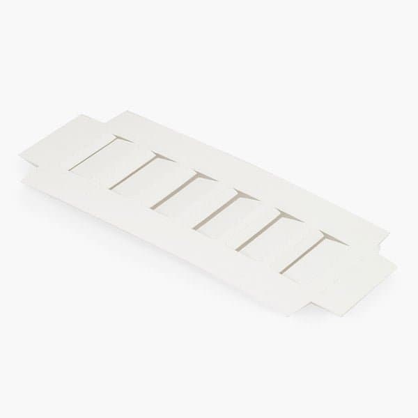 White macaron tray. Use one tray per single macaron box, use two trays per double macaron box. Complies with FDA regulations for food contact. Expandable die cut slots are 1 3/4 across, and up to 1 deep.