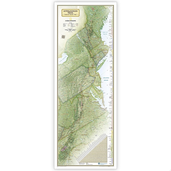Expertly researched and designed, National Geographic's map of the Appalachian Trail is ideal for fans and hikers of this magnificent national scenic trail. It makes a great planning tool or as reference to track progress on the 2,200 mile length. Developed in cooperation with the Appalachian Trail Conservancy, this beautiful poster, shows the entire length of the trail from Maine to Georgia. A unique elevation profiles highlight the trail's peaks and valleys and an informative mileage chart shows the distance between key locations. Also highlighted on the map are National Forests, National Park Service lands, State Forests and Parks, and major highways and interstates. Points of interest include Appalachian Trail information centers and shelters._x000D__x000D_The map is packaged in a full color box designed for gift giving. The box includes a large image of a section of the map inside and details including size and scale.