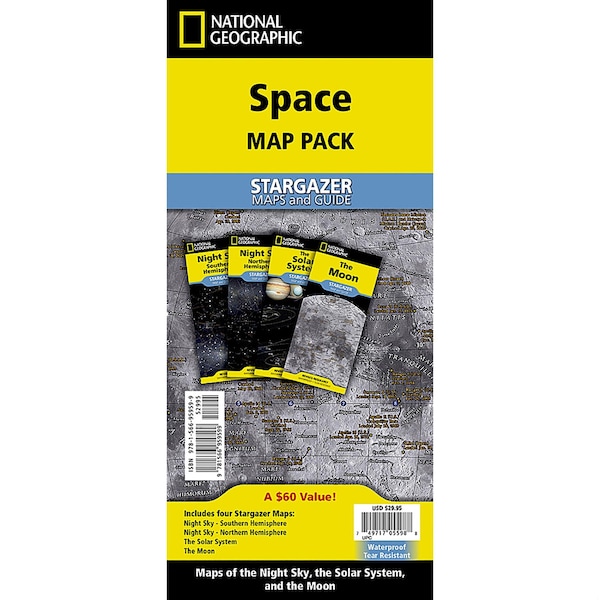 National Geographic's Stargazer Map and Guides Map Pack Bundle of Space includes maps that get progressively further from Earth on four waterproof tear-resistant maps. Each Stargazer Map and Guide shows detailed maps and graphics to help locate features on the moon, planets, and stars._x000D__x000D_The Stargazer Map and Guides are the ideal resource for exploring space from our nearest neighbor, the moon, to the farthest reaches of the visible universe. Each Stargazer Map and Guide is printed on waterproof and tear-resistant material and includes awe-inspiring images of the moon, planets, and deep space. Wherever your eyes wander the sky at night, these maps will help guide you._x000D__x000D_The Space Stargazer Map Pack includes:_x000D_Solar System_x000D_Moon_x000D_Night Sky - Northern Hemisphere_x000D_Night Sky - Southern Hemisphere_x000D__x000D_Every Stargazer Map is printed on durable synthetic paper, making them waterproof, tear-resistant and tough - capable of withstanding the rigors of repeated outdoor use.