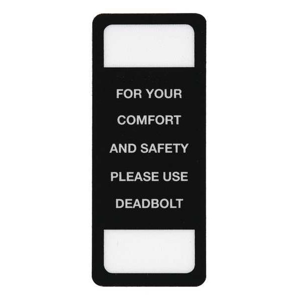Security Label, Vertical Rectangle, Number of Printed Sides 1, English, Sign Format Other Format, Sign Legend For Your Comfort and Safety Please Use Deadbolt, Sign Legend Background Color Black, Sign Legend Style Text, Sign Legend Character Height 1/8 in