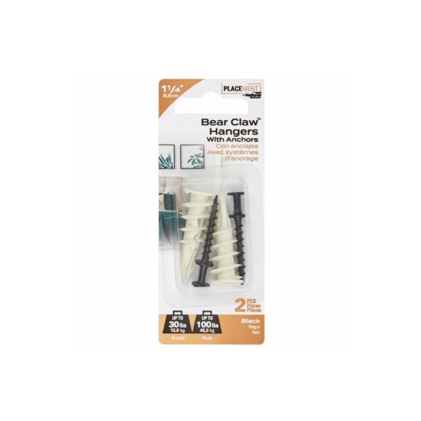 National Hardware's 2pc Bearclaw Hanger, Anchors in Black Oxide are designed to work best with Drings, wire, keyhole, and sawtooth for picture and mirror hanging solutions Made of steel material for durability Installs easily with a Philips screwdriver For interior applications Safe working load of 30 lbs in drywall, 100 lbs in stud No pilot holes required because of selfdrilling tips