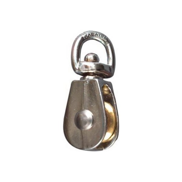 34, NoRust, Single Pulley, Swivel Eye, Safe Working Load 25 LB, DieCast Zinc Body, CopperNickel Plated, Solid Brass Sheaves